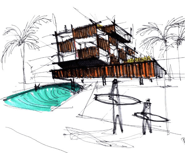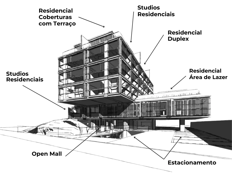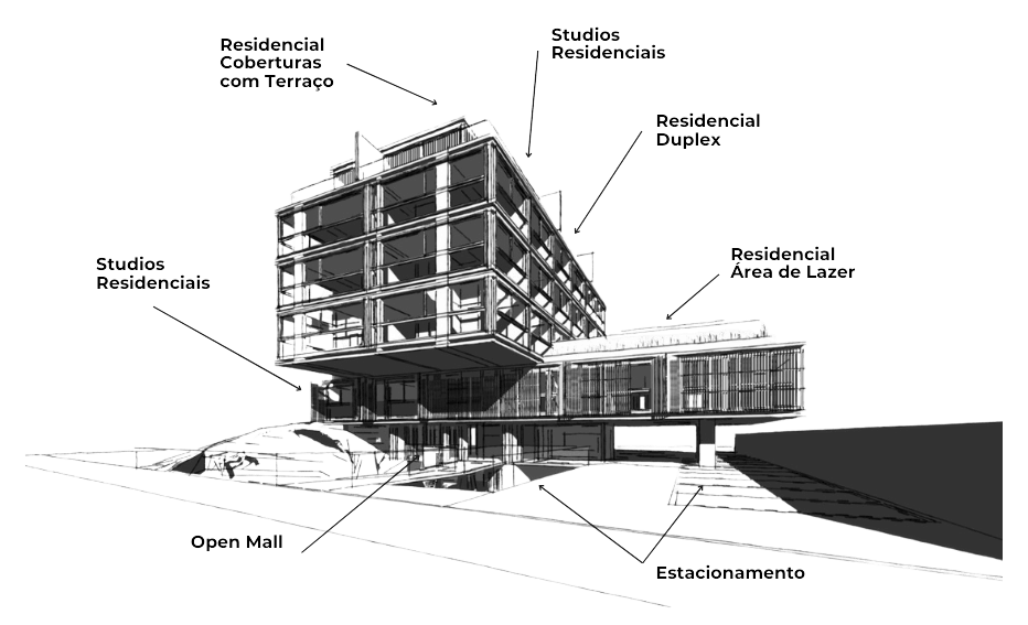 Visualize o Esboço de plantas baixas e volumetria resultado do brainstorm entre VOCAÇÃO, DNA e ALMA do terreno.